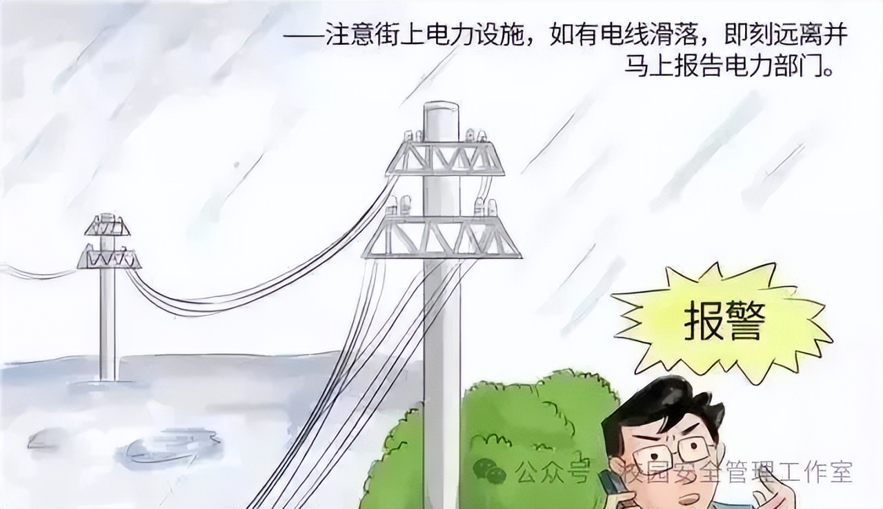 6、注意街上电力设施,如有电线滑落,即刻远离并马上报告电力部门。