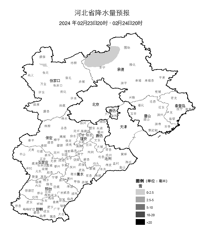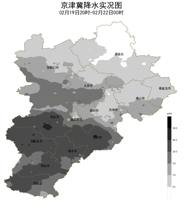 19日20时至22日0时,根据河北省142个国家级气象站数据统计,除承德中北部外,河北省其他地区出现雨雪天气(降水总站数:136),降水区平均降水量为10.4毫米,保定南部、石家庄中部、沧州中部、邯郸西部有13个站超过20毫米,沧州运河区最大为25.6毫米,石家庄主城区为21.4毫米。其中,2月20日,唐县、正定、顺平、井陉、满城、曲阳、安平、肃宁8个国家气象观测站单日降水量突破历史同期(2月)极值。(2月22日11时30分统计)
