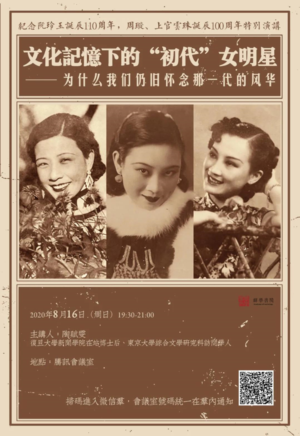 2020年是阮玲玉诞辰110周年,周璇、上官云珠诞辰100周年。银幕作为历史记忆的承载,已经跨越百年数代,现而今为何我们还对“初代”女明星思忖依旧、念念不忘?8月16日晚,群学书院邀请戏剧与影视学博士、新闻传播学博士后陶赋雯举行在线演讲,从文化记忆视域,以形象记忆、流行文化记忆、哀悼记忆来体察对“初代女明星”的凝视快感、摩登崇拜和死亡传奇,思考我们今天仍旧怀念阮玲玉、胡蝶、周璇、上官云珠等电影明星的文化动因。