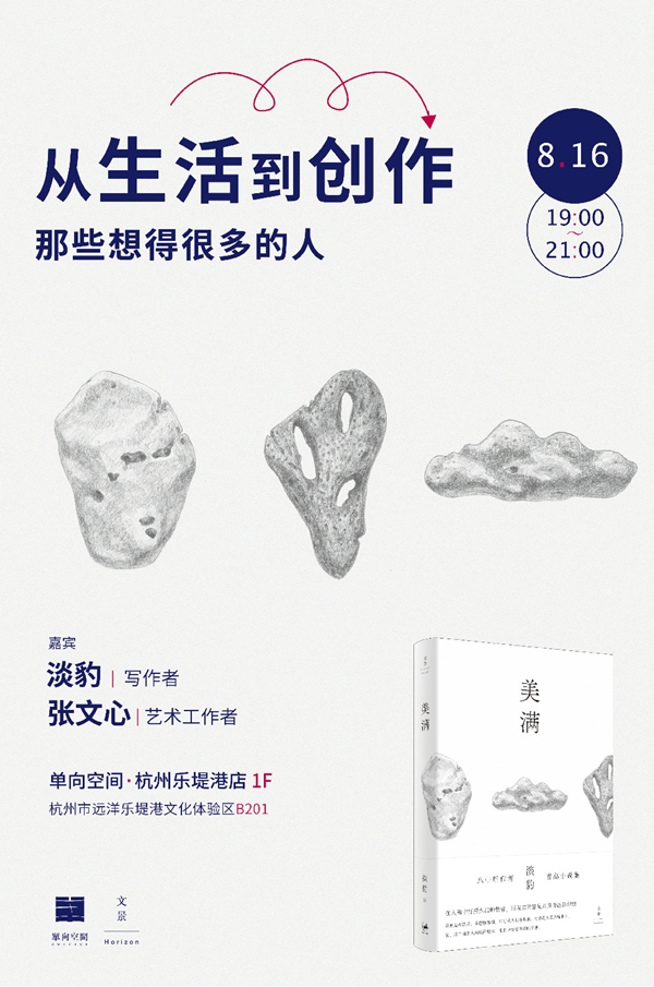 热爱创作的人,可能有一个共同点:他们都有更大的好奇心,对大多数人习以为常、不假思索地接受的事情想得更多。淡豹最新小说集《美满》中也有很多想得很多的人,他们怀有愤怒和说不清道不明的情绪,对生活戒不掉渴望。8月16日,作家淡豹将携新书《美满》做客单向空间·杭州乐堤港店。本次活动,淡豹也邀请了她熟悉的一位艺术家张文心,一起来谈谈她们生活中、创作中的情绪和渴望。