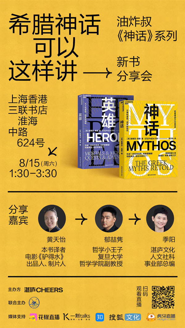 希腊神话好看,但是要想入门却不是一件轻松的事,很多人对希腊神话中复杂的人名和地名感到十分头疼,混乱的时间线也在一定程度上加大了阅读困难。英国喜剧大师、有声书领域的国宝级人物“油炸叔”斯蒂芬·弗莱,在新书《神话》和《英雄》中完美解决了这些问题。8月15日下午,本书译者、《驴得水》出品人制片人黄天怡,复旦大学哲学系副教授郁喆隽,湛庐文化大社科总编季阳将带领你一起品读《神话》《英雄》,在作者极具英式幽默感的细致描摹下,一起探寻千年前的神怪传奇,走进希腊神话的玄妙世界。