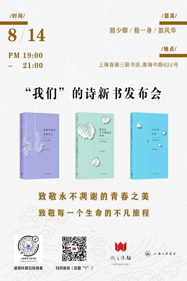 “我们”的诗系列,源自一群可爱而极富探索精神的诗人,他们最初和一直活跃在北大的“我们文学社”皆有一定之关系,他们始终持着那份对于生命的最初的热爱,一直按照自己的方式观看世界,按照自己的方式表达与述说,并始终持有那份诗人的谜之骄傲。第一辑收入胡少卿、程一身、邵风华三位诗人的诗选。8月14日晚,三位诗人将来到上海香港三联书店,与读者分享他们的诗歌。