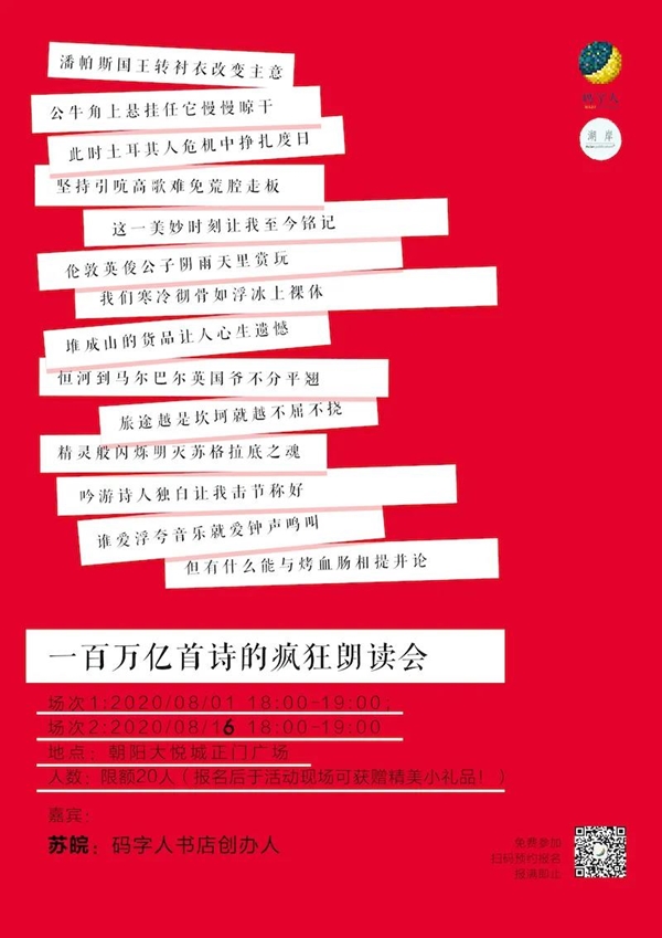 一首诗,是一次邀约,是一次倾诉。它的谈话对象,可能是一个知己,可能是诗人自己,可能是我们大众。只要找对路径,每一个人都能找到诗歌真相,欣赏诗歌之美。8月15日晚,让我们相约码字人书店,一起读诗,一起论诗。