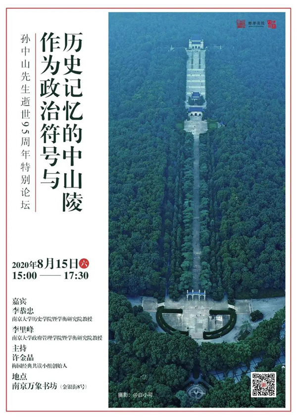 南京中山陵既是民主革命先行者孙中山先生(1866-1925)的陵墓,也是具有浓厚的现代政治文化内涵的公共符号,集中体现了国民党借助伟人墓葬来塑造主流历史记忆、营造新式象征权威、增进民族国家认同的努力。2020年时值孙中山先生逝世95周年,群学书院联袂梅园经典共读小组,邀请南京大学李恭忠、李里峰教授,围绕李恭忠著作《中山陵:一个现代政治符号的诞生》,展开有关政治符号与历史记忆的跨学科讨论,以丰富我们对中国现代历史的多角度解读。
