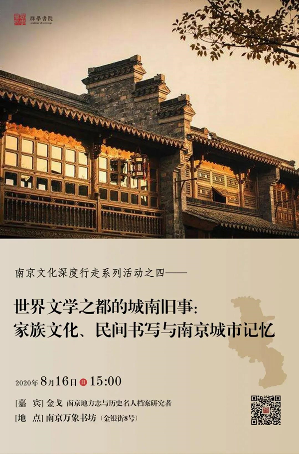 8月16日,群学书院邀请南京地方史志专家金戈,以南京老城南三部民间文学作品为例,通过详细解读作品内容、形成过程和文学价值,重点介绍清末、抗战前后、改革开放前后三个时期家族文化对作者文学创作的影响,以及作品对其他家族成员的影响,并呈现出它们所承载的南京城市记忆。