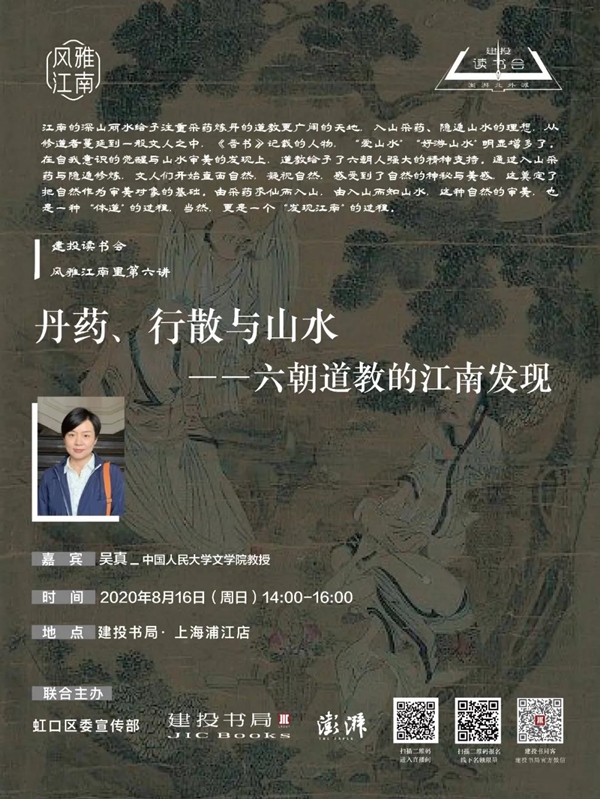 江南的深山丽水给予注重采药炼丹的道教更广阔的天地,入山采药、隐遁山水的理想,从修道者蔓延到一般文人之中,《晋书》记载的人物,“爱山水”“好游山水”明显增多了。在自我意识的觉醒与山水审美的发现上,道教给予了六朝人强大的精神支持。通过入山采药与隐遁修炼,文人们开始直面自然,凝视自然,感受到了自然的神秘与美感,这奠定了把自然作为审美对象的基础。由采药求仙而入山,由入山而知山水,这种自然的审美,也是一种“体道”的过程,当然,更是一个“发现江南”的过程。8月16日,我们有幸邀请中国人民大学文学院教授吴真老师,她将从道教的角度,为我们揭示六朝时期的文人对于“江南”的发现与体认。