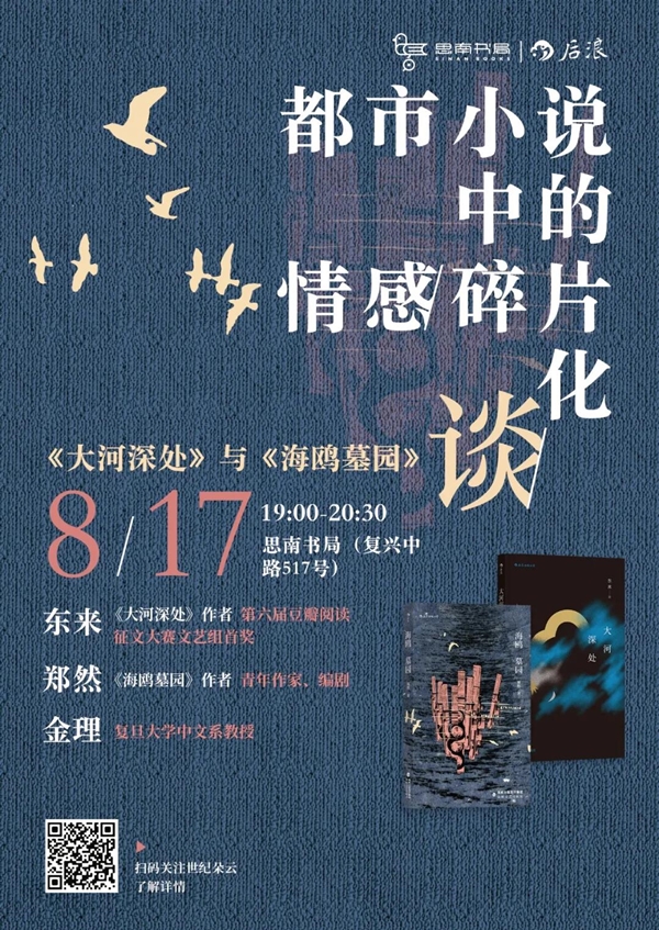 在都市生活中,每个人在感情中的位置不断变换,人们切入情感的方式往往更为碎片化。我们如何面对这些情感?作家们又如何在小说中处理这种情感?《海鸥墓园》由15个海市蜃楼般的情感故事切片组成,作者郑然用文字把难以捕捉的情感与思绪凝固成形;东来的《大河深处》则以极富质感的典雅语言打捞记忆,描画多种如梦的人生,故事的通俗性与文学性在她的笔下实现了绝佳调和。8月17日晚,两位青年新锐作家东来、郑然,以及青年学者金理,将在思南书局和读者们聊聊都市小说里的游荡主题,并谈谈关于如何用小说书写当代青年亲密关系的见解。