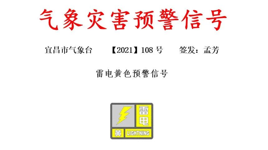 7月18日15时24分,宜昌市气象台发布雷电黄色预警信号:预计未来6小时,宜昌城区及周边将有雷电活动,局部雨量30-50毫米,阵风6-8级,请注意防范!