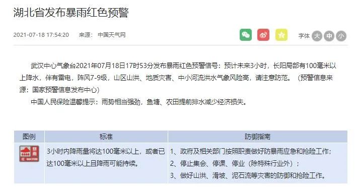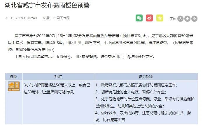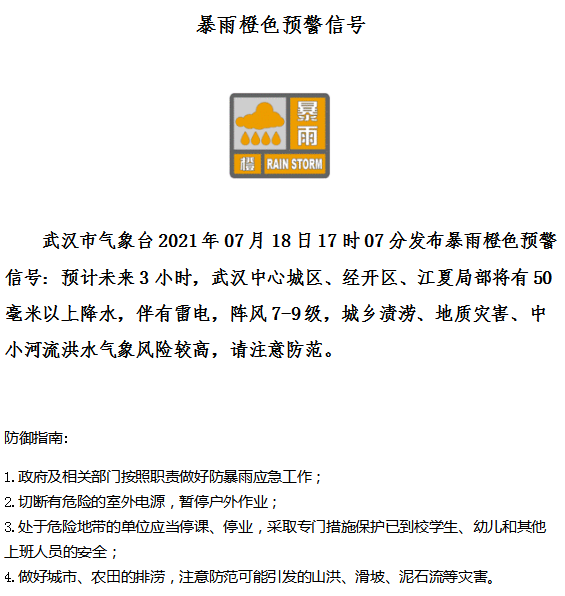 武汉市气象台2021年07月18日17时07分发布暴雨橙色预警信号:预计未来3小时,武汉中心城区、经开区、江夏局部将有50毫米以上降水,伴有雷电,阵风7-9级,城乡渍涝、地质灾害、中小河流洪水气象风险较高,请注意防范。