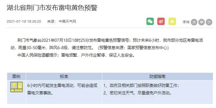 襄阳市气象台2021年07月18日15时04分发布雷电黄色预警信号:预计未来6小时,襄阳市区、襄州、老河口、谷城有雷电活动,局部雨量30-50毫米,阵风6-8级,请注意防范。