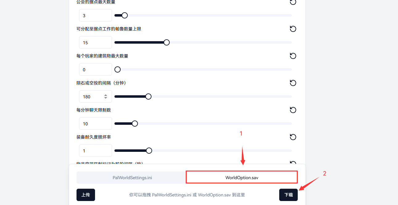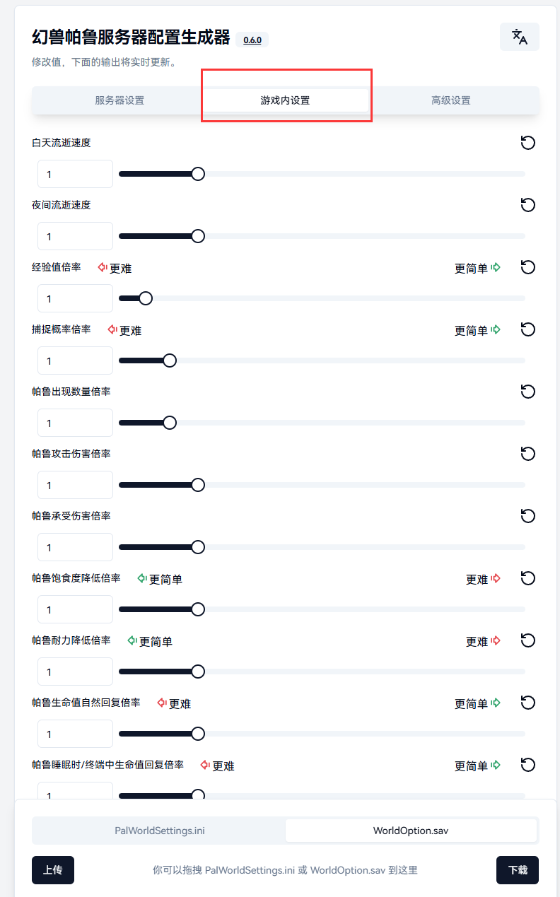PS:如果你还要在调整配置文件,你只需要 WorldOption.sav 把下载到电脑上,然后上传到 兽帕鲁服务器配置生成器 这样就可以重新修改了