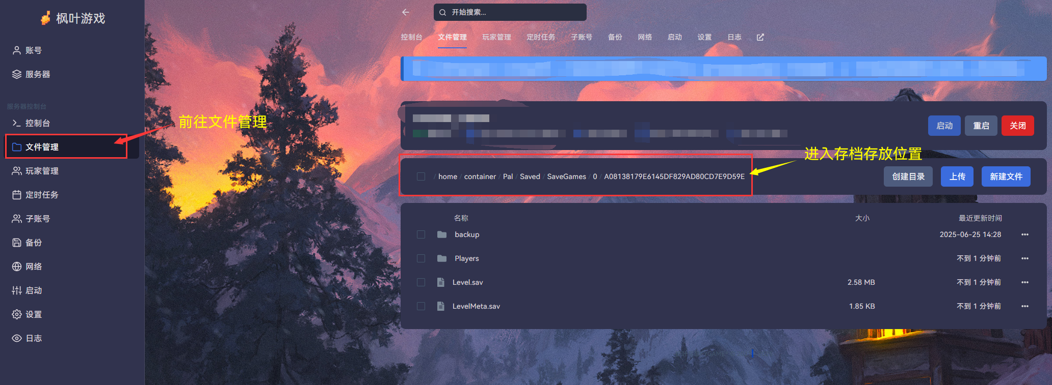 前往服务器的 文件管理 下,前往 /home/container/Pal/Saved/SaveGames/0/xxxxxxxxxxxxxxxxxx 存档目录