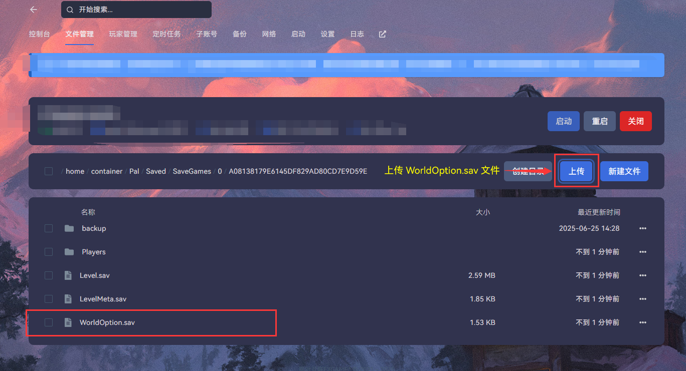 将你在 兽帕鲁服务器配置生成器 下载的 WorldOption.sav 配置文件,上传到 存档目录 里面