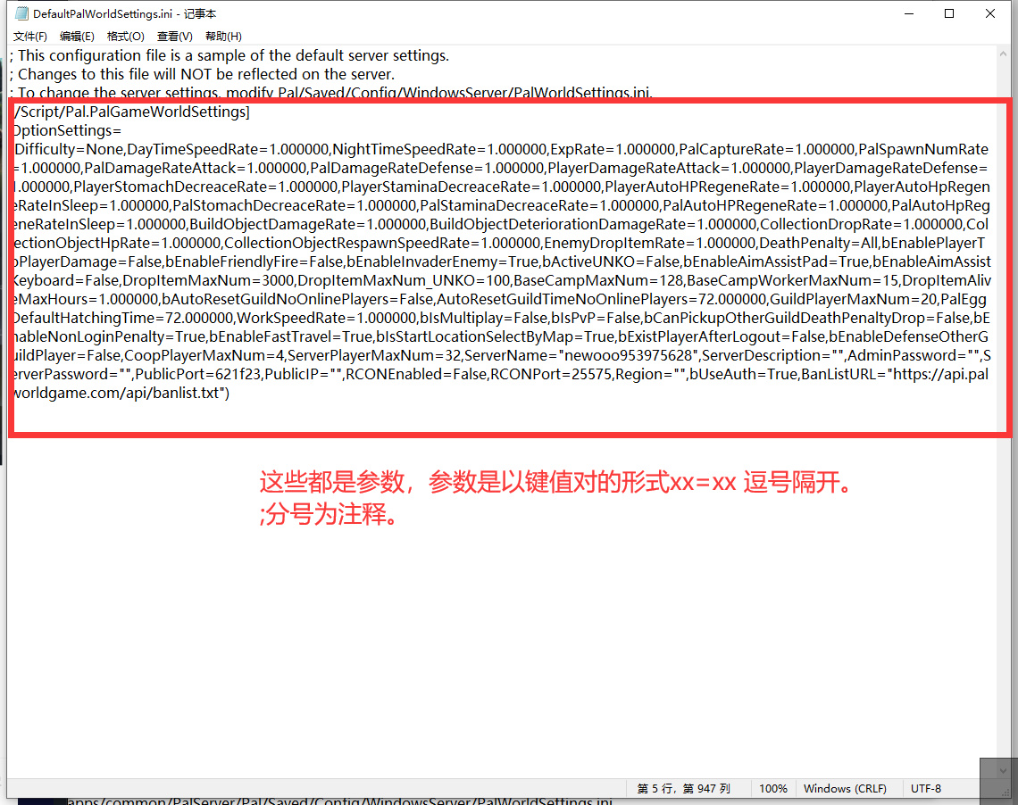修改完值,复制到PalWorldSettings.ini里面即可。