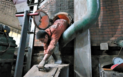 一名工作人员爬进一台锅炉里面修理设备。这台锅炉是不久前停火的,里面还有30多℃,炉底铺着一层灰烬,工作人员弯着腰在检修,脑门上一串串的汗珠掉在灰烬里。当他修理完设备,从检修口钻出来后,才顾上擦擦满头的汗水。