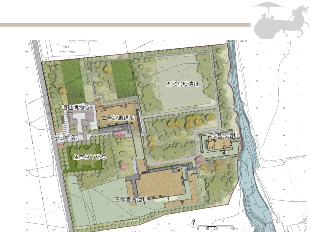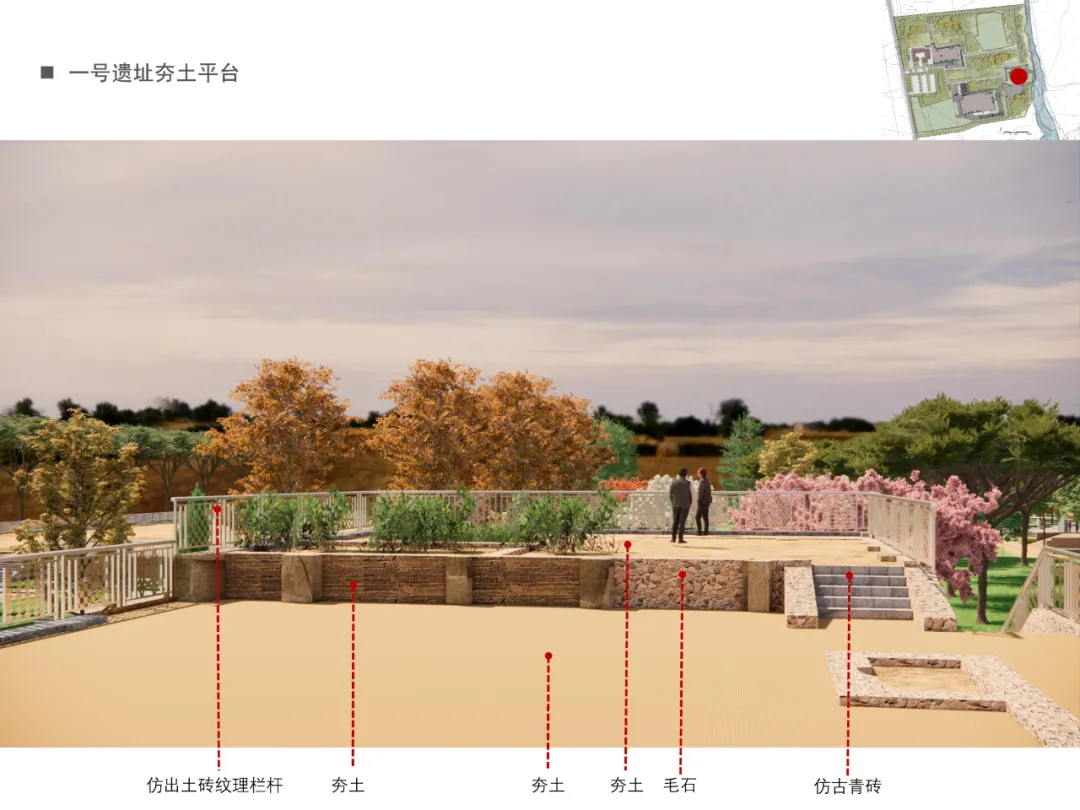 整个保护展示工程,将利用景观标识设计手段对不同宫殿遗址进行展示。对于经考古发掘实证信息明确的遗址,使用夯土、仿古砖等材料予以重点、详细展示(一二三号宫殿遗址考古发掘部分),针对经考古勘探,信息尚不明确的遗址,使用绿植、草皮等材料做标识展示(三号、五号遗址考古勘探部分)。