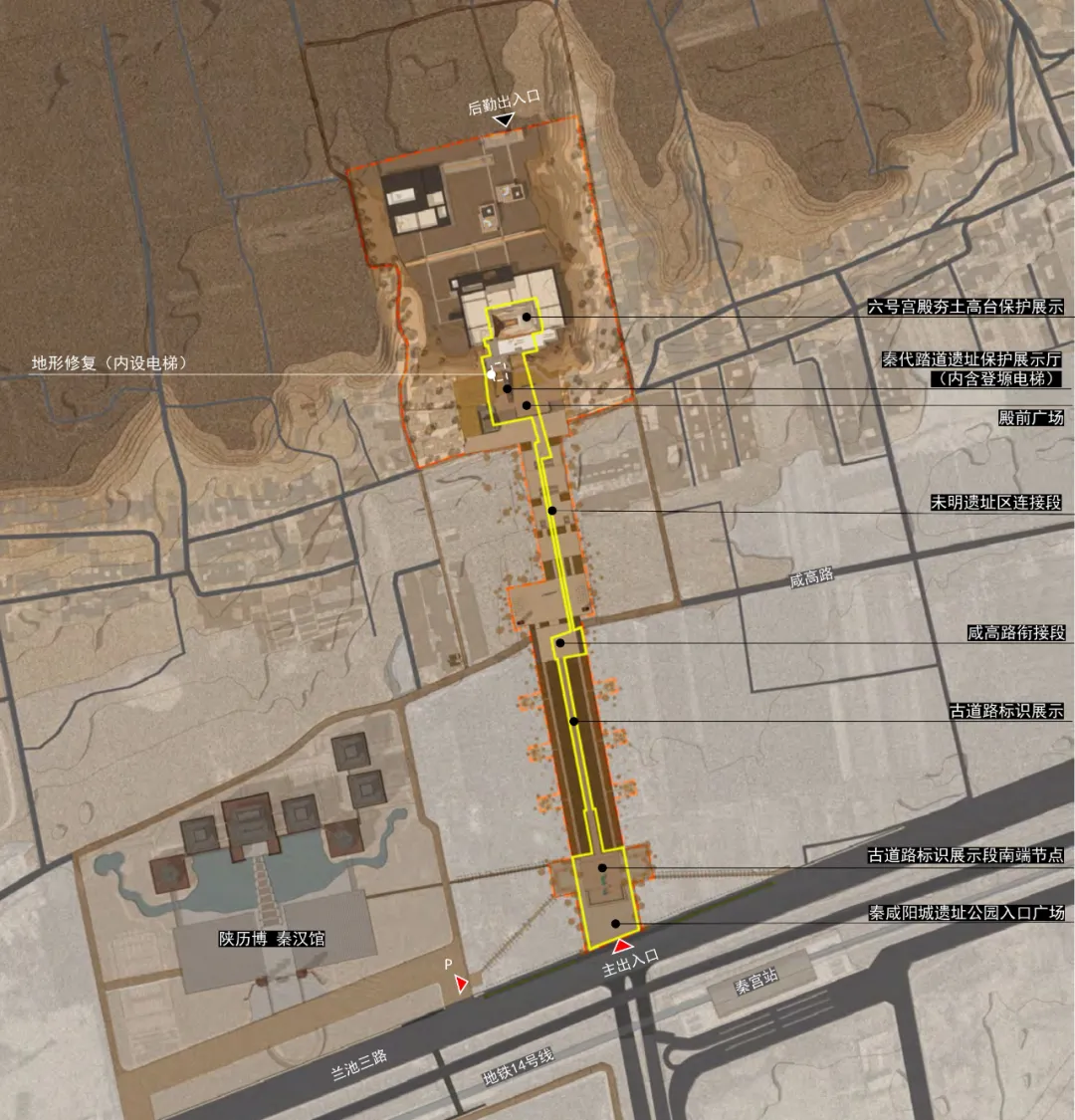 秦咸阳城六号宫殿及殿前古道路遗址保护展示工程,自南向北依次为塬下古道路遗址保护展示区、踏道遗址保护展示区、六号宫殿高台建筑遗址保护展示区。