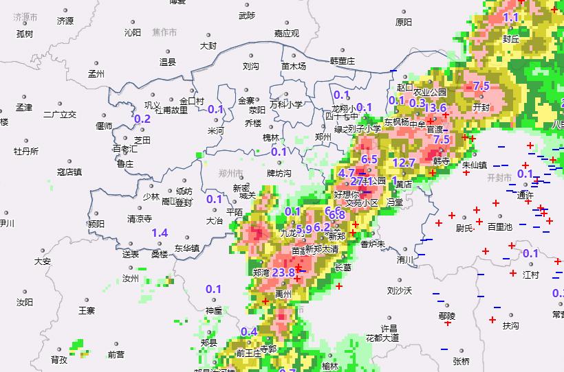 目前,航空港区、新郑、中牟、新密南部有对流降水回波,最大回波强度45~55dBZ。过去1小时最大降水量位于航空港区的文苑小区站27.1毫米。