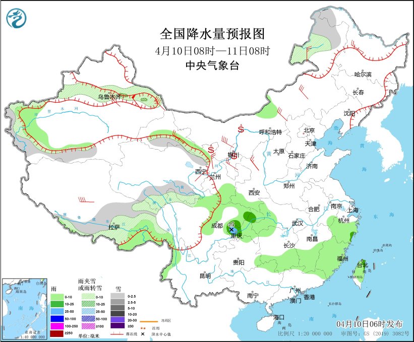图4 全国降水量预报图(4月10日08时-11日08时)