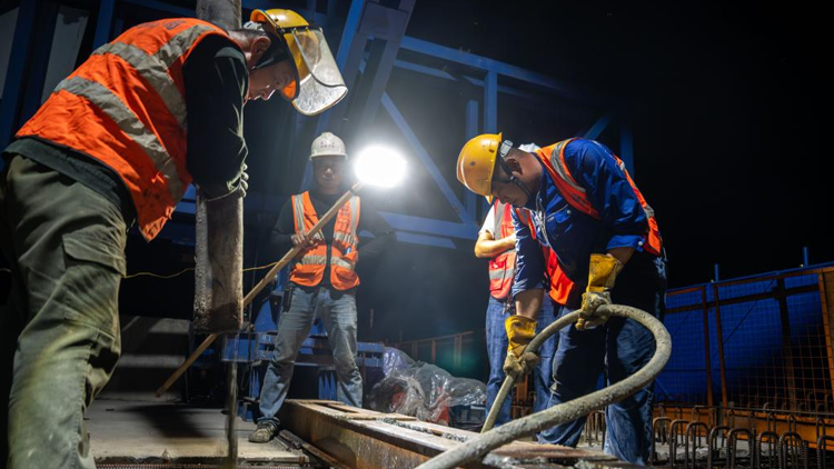 7月6日凌晨,在邵永高铁跨S236省道大桥施工现场,中铁五局工人进行连续梁合龙施工(无人机照片)。当日,在湖南省永州市东安县芦洪市镇,由中铁五局承建的邵永高铁全线首座连续梁——跨S236省道大桥连续梁成功合龙,标志着邵永高铁建设取得重大进展,为后续架梁施工奠定坚实基础。