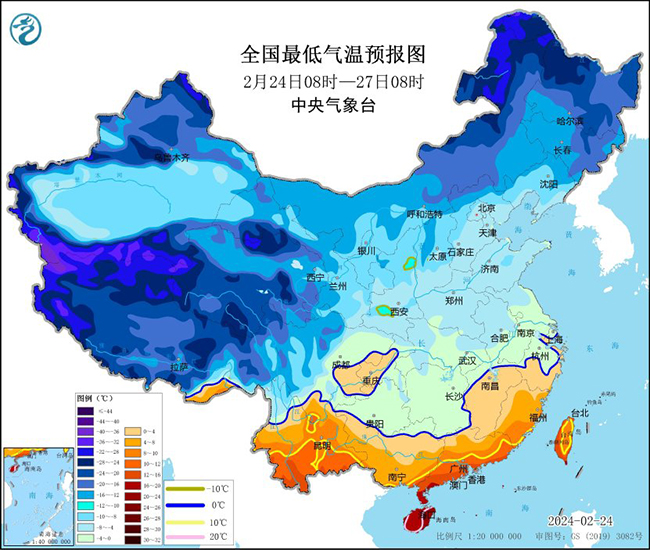 图2 全国最低气温预报图(2月24日08时-27日08时)