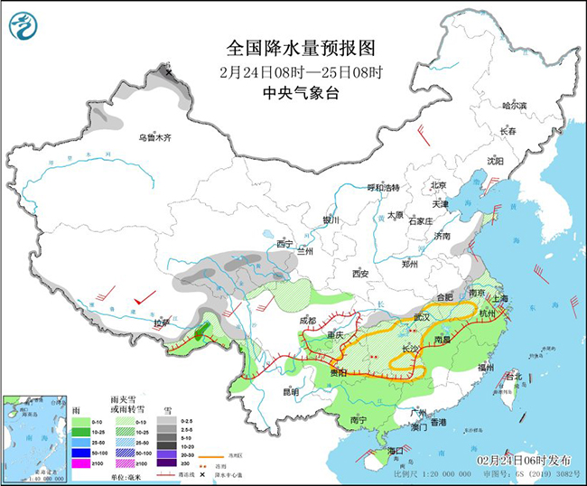 图4 全国降水量预报图(2月24日08时-25日08时)