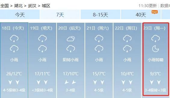 最低气温:鄂西北8-11℃;其他地区12-15℃