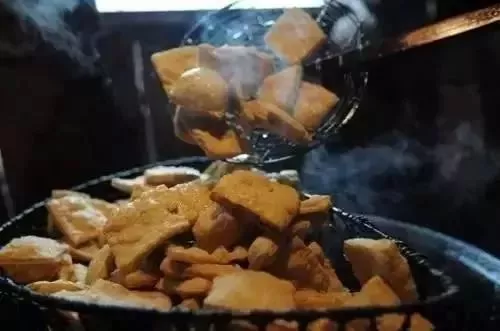 臭干是东台有名的小吃,夹起一块臭干,蘸一点虾油调料,放入口中。酥脆有味,虽有微微的臭味,但随之而来的是豆制品的香味,配上虾油,更觉味美可口。