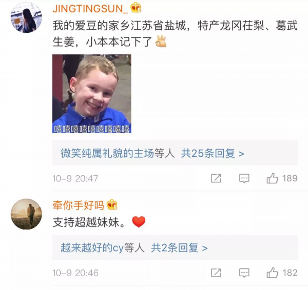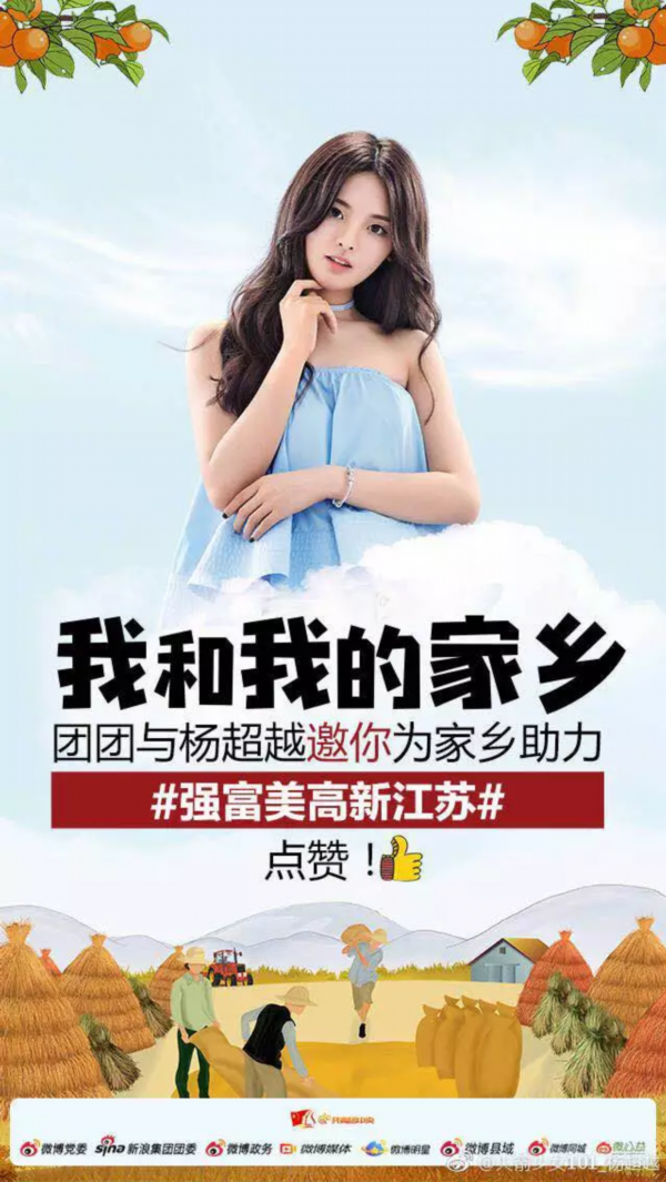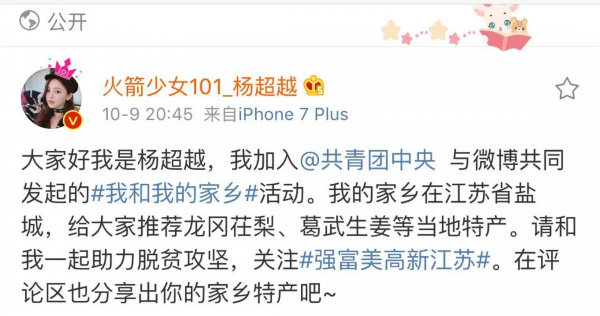 昨晚,“全村的希望”杨超越加入了团中央和新浪微博共同发起的#我和我的家乡# 话题 ,在微博上点赞了盐城的特产,助力扶贫攻坚,给盐城乡亲们的腰包吹口气。