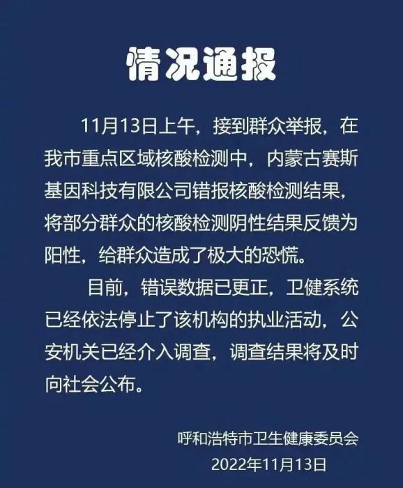 呼和浩特市卫健委发布情况通报:11月13日上午,接到群众举报,在重点区域核酸检测中,内蒙古赛斯基因科技有限公司错报核酸检测结果,将部分群众的核酸检测阴性结果反馈为阳性,给群众造成了极大的恐慌。目前,错误数据已更正,卫健系统已经依法停止了该机构的执业活动,公安机关已经介入调查,调查结果将及时向社会公布。详情: