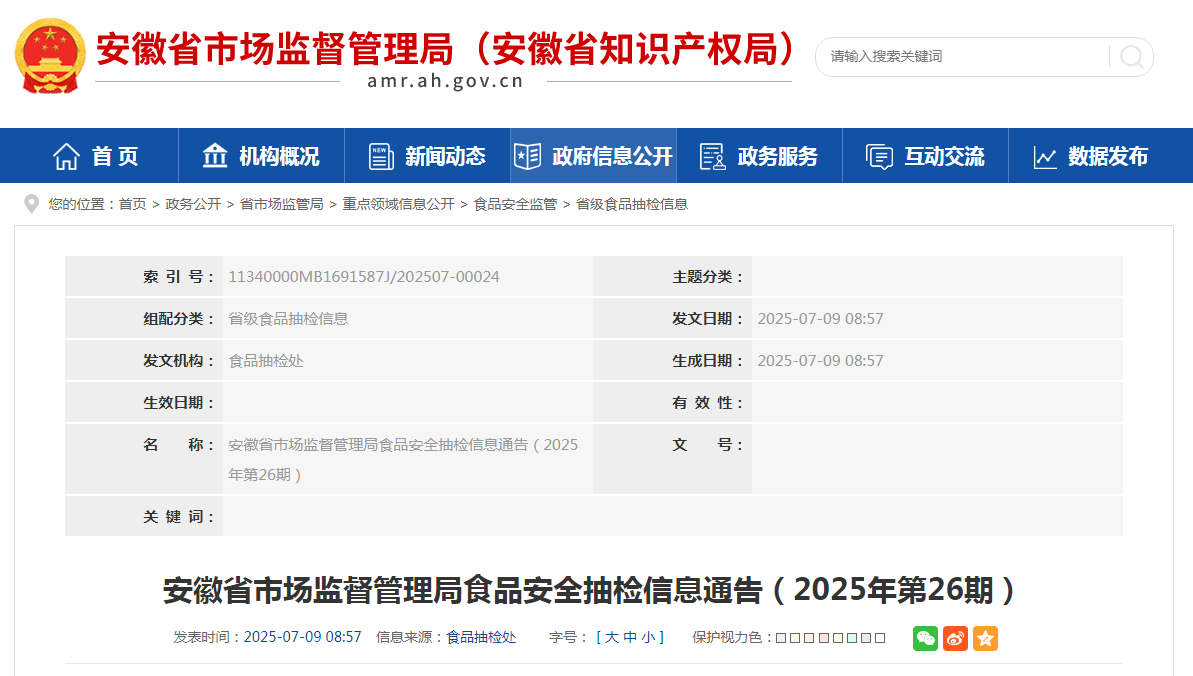 安徽省市场监督管理局食品安全抽检信息通告(2025年第26期)