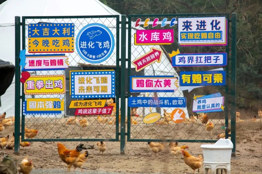 在共富鸡场,随处可见五颜六色的展示架,上面挂满了印有网络流行语的标牌。孩子们可以参观孵化室,还可以在鸡场里四处捉鸡、寻蛋,大人们则可以在草地上支起天幕,围坐品茶。