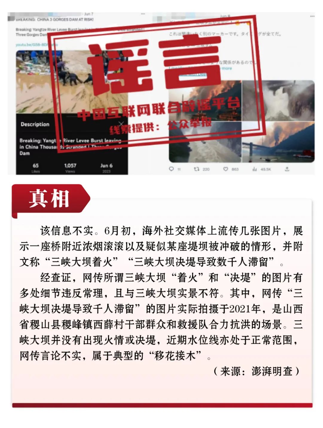 移花接木,凭空捏造事实博关注。纵观6月网络谣言,还需警惕的是,个别网民为博取关注,不惜移花接木、凭空捏造不实信息。如有网民恶意造谣“山西一女幼师给幼儿喂避孕药”“上海仁济医院(东院)存在医生嫖娼、组织卖淫”,经调查,这些人造谣的目的纯属是为了吸引眼球、博取关注,均已被警方依法严肃查处;海外社交媒体上流传所谓“三峡大坝‘着火’‘决堤’”,也是以移花接木伎俩,往我国家标志性工程身上“泼脏水”;而网传“上海市司法局拟录用的38名公务员大部分是留学生”,则是对今年上海公务员招录工作的歪曲混淆、以偏概全,其真实目的是吸引眼球、获取流量,谋取私利。