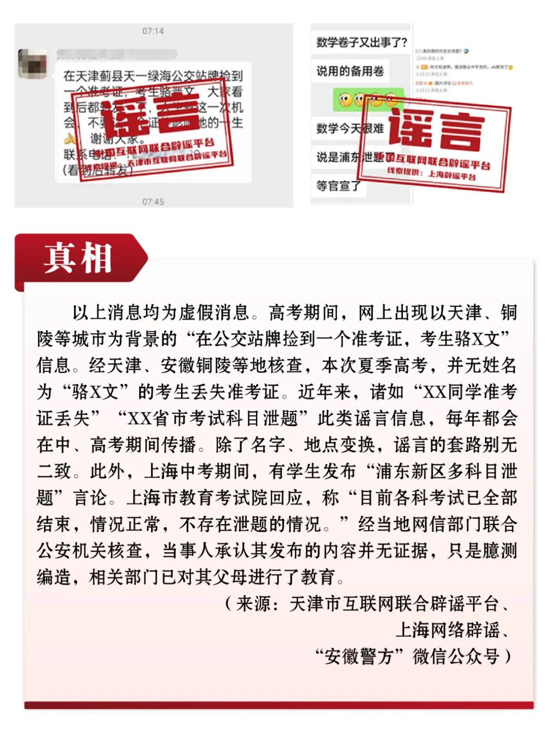 翻炒旧谣,搭蹭高考热点扰秩序。6月初,2023年全国高考拉开帷幕,与此同时,涉高考高招相关谣言借机潜滋暗长,扰乱招考秩序。如“天津、安徽等地有考生‘骆X文’丢失准考证”“张X银录取通知书掉在103路公交车上”等谣言戏码几乎每年“高考季”都在上演,换个地方、人名再来个旧谣新传,其造谣套路如出一辙。“安徽铜陵一学生高中三年花费47万元,高考考了369分”“湖南四个高考生被骗去缅北”等涉考生假新闻,或夸大事实博取关注,或罔顾事实信口开河,给考生和家长添堵,给涉高考秩序氛围添乱。此外,7月,各大高校开始招生录取工作,暑假旅游旺季亦随之而来,需对招生录取诈骗套路、暑期出游骗局陷阱等保持高度警惕。