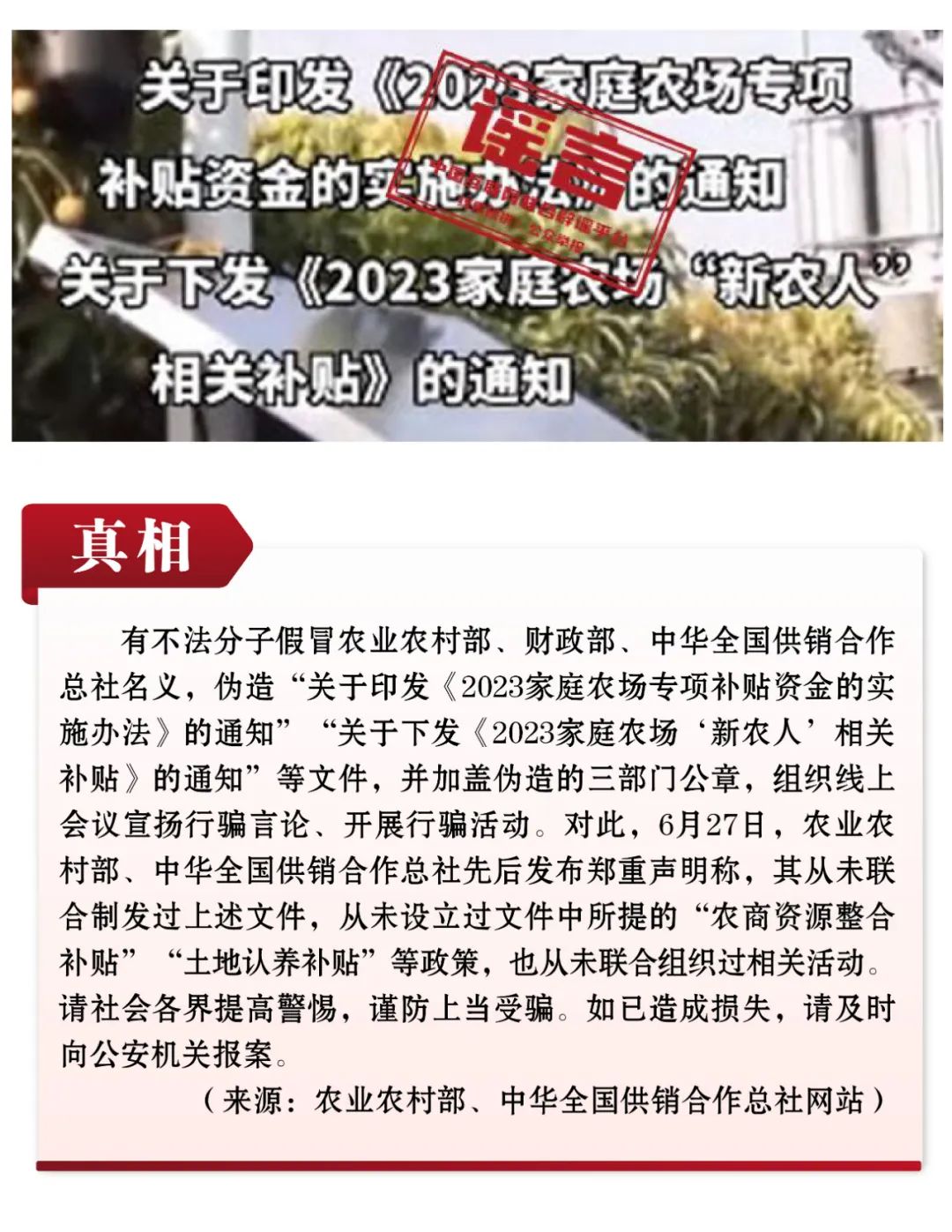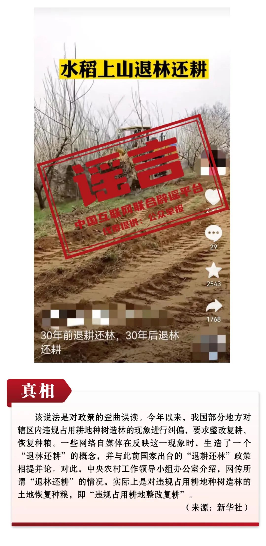 歪曲杜撰,冒用官方名义设骗局。不法分子冒用国家部委、国企或权威机构名义,伪造文件、捏造虚假信息对外发布,企图扰乱正常市场秩序并从中行骗牟利。诸如“财政部发行金融债券”“三部门联合发文将发放家庭农场等专项涉农补贴”“国铁集团授权‘八纵八横 ’APP推出理财产品”“中国商飞发布‘C919私募基金’等投资理财项目”等信息迷惑性极强,实为骗子以高额返利为诱饵设置的陷阱。此外,还有自媒体歪解误读公共政策,有意混淆概念误导公众。如,针对“违规占用耕地整改复耕”,生造“退林还耕”概念,并将其与此前国家出台的“退耕还林还草”政策相提并论,实质是对加强耕地保护和用途管控的歪曲。
