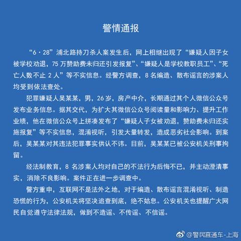 【真相】据上海警方通报:“6·28”浦北路持刀杀人案发生后,网上出现的“嫌疑人因子女被学校劝退,75万赞助费未归还引发报复”、“嫌疑人是学校教职员工”、“死亡人数不止2人”均为不实信息。经警方调查,8名编造、散布谣言的涉案人均受到依法查处。 犯罪嫌疑人吴某某,男,26岁,房产中介,长期通过其个人微信公众号发布业务信息。据其交代,为扩大其微信公众号阅读量和影响力、提升工作业绩,他在微信公众号上拼凑发布了“嫌疑人子女被劝退,赞助费未归还实施报复”等不实信息,混淆视听,引发大量转发,造成恶劣社会影响。到案后,吴某某对其违法犯罪事实供认不讳。6月30日,吴某某已被公安机关刑事拘留。同日,上海市网信办协调有关部门注销吴某某的微信公众号。