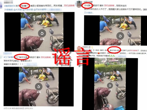 【传闻】近日,一则配文为“外卖小哥惨遭耳机线割喉”的视频被冠以不同地名热传。时长7秒的视频中,有两辆电动车倒在路上,一名身着黄色外卖服的电动车驾驶者在车前倒地,不住抽搐,另一名身着蓝色衣服的电动车驾驶者从地上缓缓爬起,两人身上均有血迹,周围人在用方言喊着“快打110”,视频中没有出现“耳机线割喉”的情况。这段视频被冠以江苏徐州、河南漯河、陕西开封、福建漳州等地的不同街道路名在微博、微信中大量传播。
