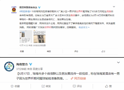 【传闻】6月17日到19日,海南琼海、四川成都、江苏南京等地微博、微信群、朋友圈流传着不同版本“世界杯赌球输钱跳楼”的视频和文字消息,视频内容是不同的“跳楼自杀现场”,配发的文字是“某地一男子赌球跳楼”“一男子连续赌球赔了300多万一了百了”等内容。
