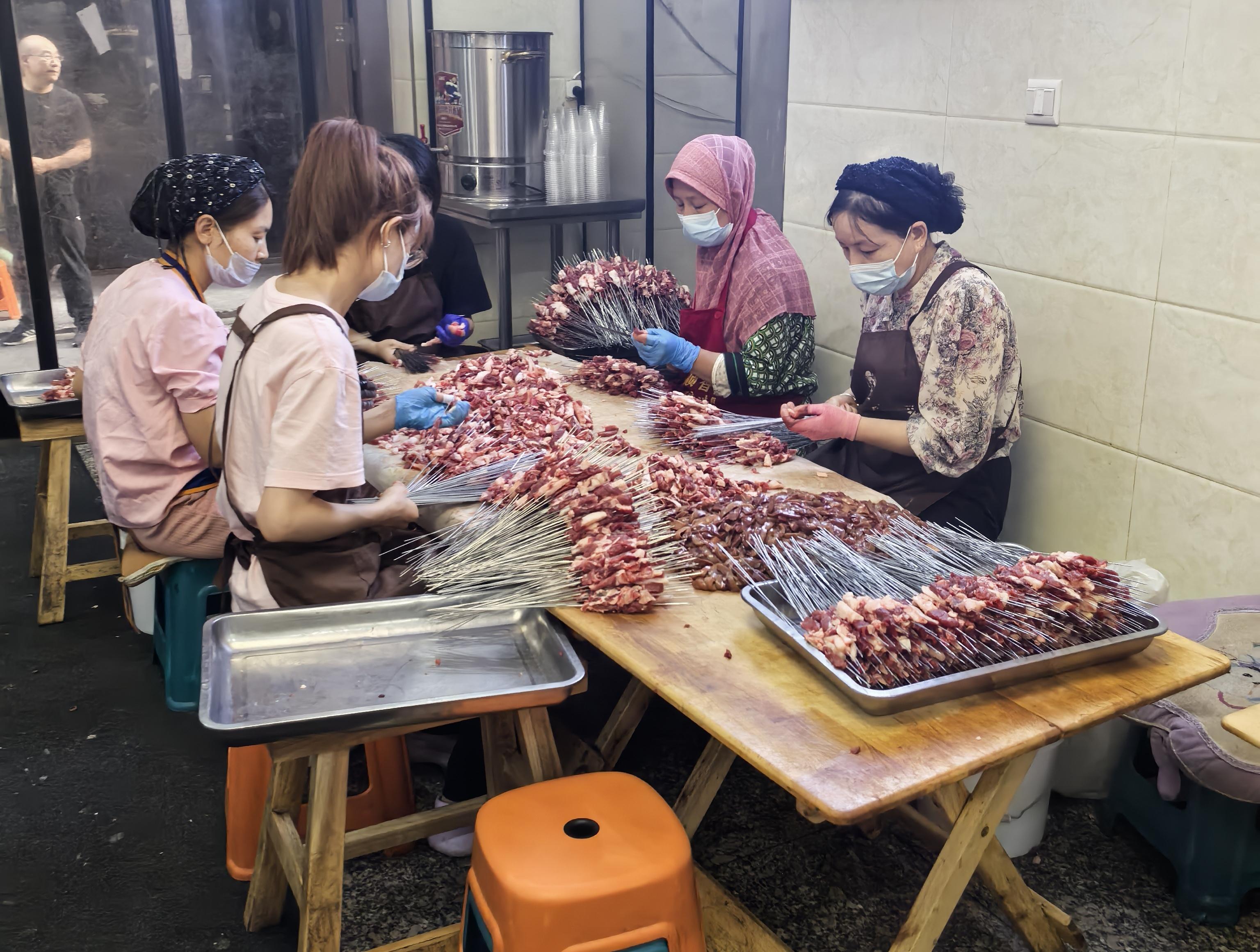 苏文胜说,胜胜烤肉是开在家门口的店,虽然路有点绕,不好找,但坚持好食材好口味,获得不少回头客。红埠街店有30桌左右,每天烤串的销量周内在8000串左右,周末翻倍,高峰时期排队的人数就达上百人。烤肉最重要的是肉新鲜,他亲自把控肉品质量,当天宰杀的牛羊,肉必须先进排酸库冷藏10-12小时后使用,这样肉质才更鲜嫩可口。希望这一串串饱含诚意的烤肉,能成为连接食客与西安纽带,让西安的美食文化香飘万里。