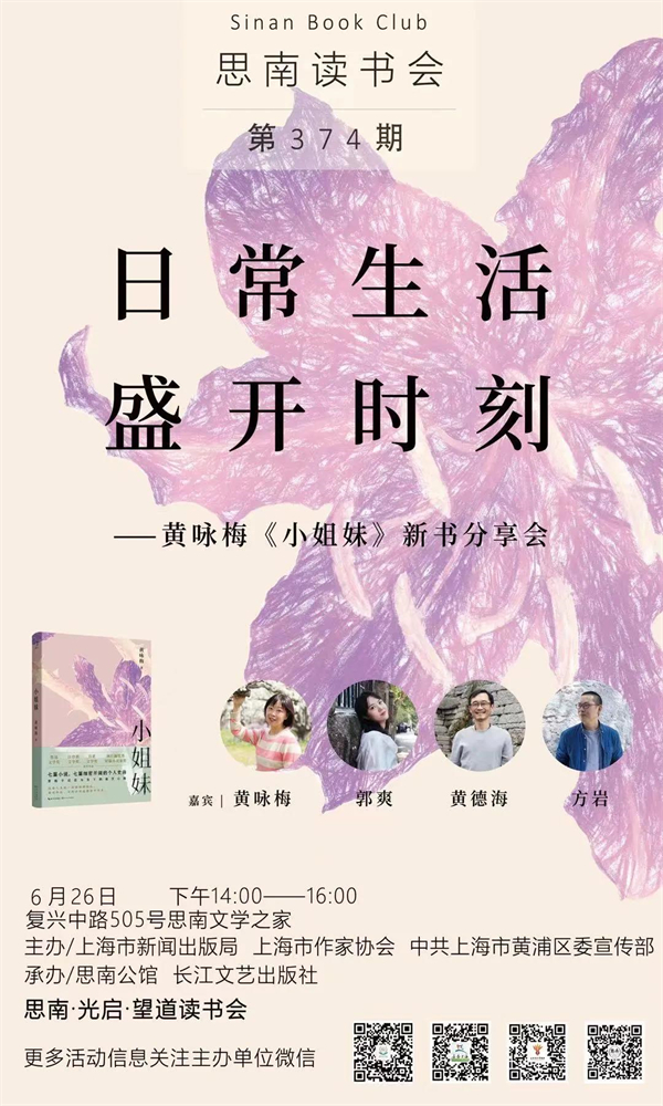 日常的艰难与困顿,内心的远方与渴望,在黄咏梅的小说中,常常构成一个外与内并行的双线条叙事,让她笔下的日常生活,显得浩大且舒朗,好似激烈又热忱的小姨,执着又敏感的女作家,游移又坚韧不拔的父亲……我们难以为黄咏梅笔下的故事固定一个面貌,我们只能说,这是生活本身。在逐渐抛却性别色彩的二十一世纪文艺小说中,互联网文化浪潮下,黄咏梅所代表的成熟气质的女性作家们,正在试图深入新世纪精神世界的辽阔之地,托起一个多变又坚决的世界。6月26日下午,黄咏梅将携带她最新的小说精选集《小姐妹》,和作家郭爽、评论家黄德海、方岩,共同探讨那些日常生活的盛开时刻。