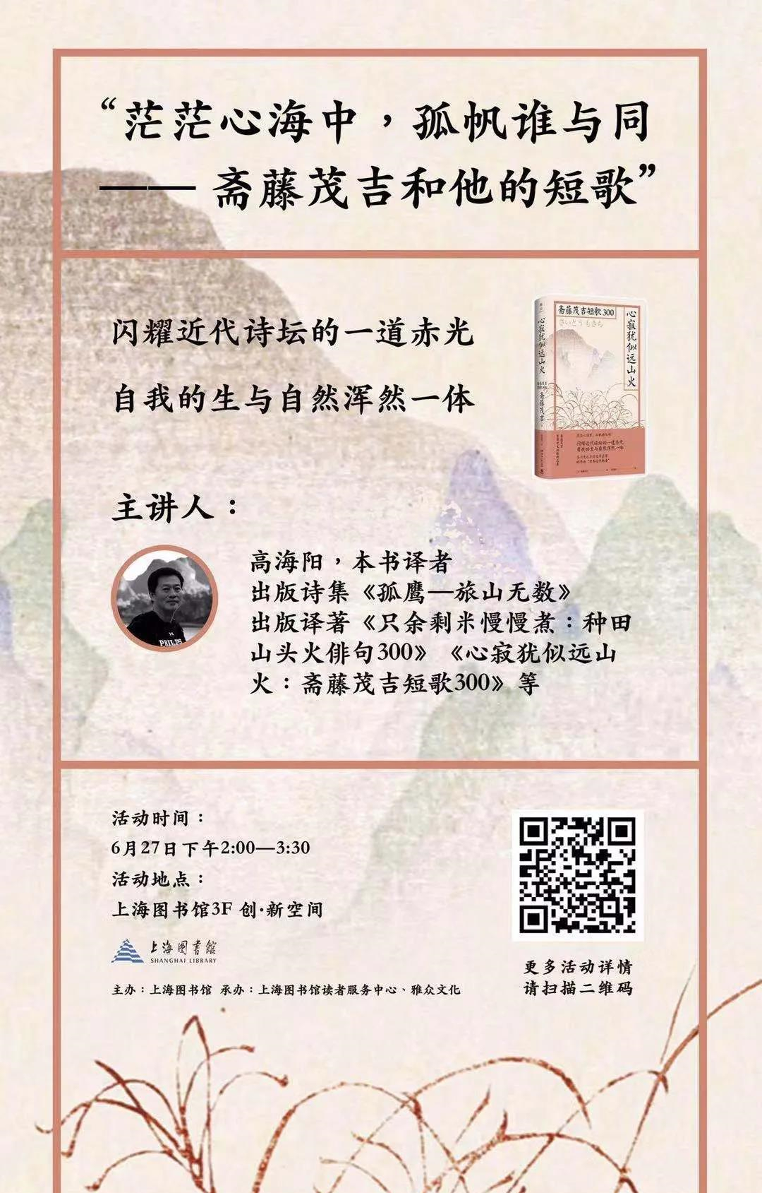 “短歌”始于公元六七世纪,是日本和歌众多诗体中的一种。进入近代,许多歌人都尝试对传统和歌进行革新。斋藤茂吉正是短歌近代化的一个主要的领军人物,后有“近代歌圣”之美誉。6月27日下午,斋藤茂吉首部中译版短歌精选集《心寂犹似远山火:斋藤茂吉短歌300》的译者高海阳老师将做客上图·悦读汇分享会现场,细细解读短歌和俳句、斋藤茂吉的人生,以及他所作的充满感情而富有张力的短歌,带领各位读者一同欣赏品鉴闪耀日本近代诗坛的那一道赤光。
