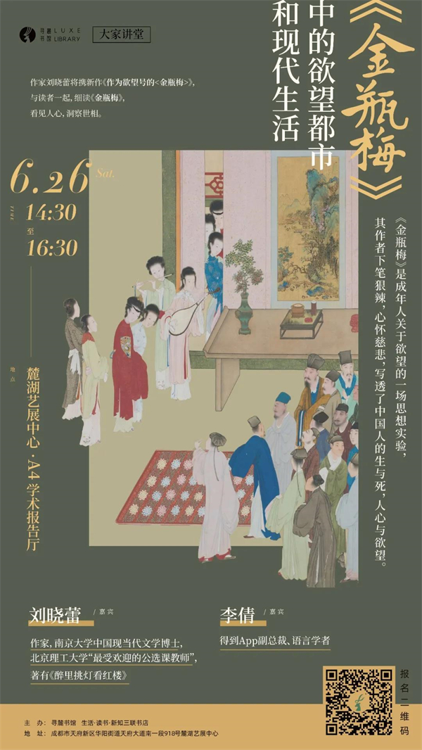 6月26日,作家刘晓蕾将携新作《作为欲望号的<金瓶梅>》,做客寻麓,与得到副总裁、语言学者李倩一起,带大家领略这部伟大的“凡人生死书”。欢迎读者与刘晓蕾一起,细读《金瓶梅》,看见人心,洞察世相;思考生与死,远离恐惧,放下傲慢与偏见,获得爱的能力。