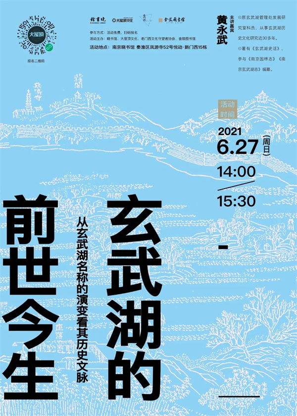 在近二千年的历史长河中,玄武湖已成为一个孕育着文化和艺术的温床,对南京的历史文化发展产生过一定的影响,众多的风云人物为玄武湖留下了不朽的传奇与诗文。6月27日,大屋顶文化特邀原玄武湖管理处发展研究室科员黄永武做客南京晓书馆,就“玄武湖的前世今生”主题,与各位读者一起“从玄武湖名称的演变看其历史文脉”。