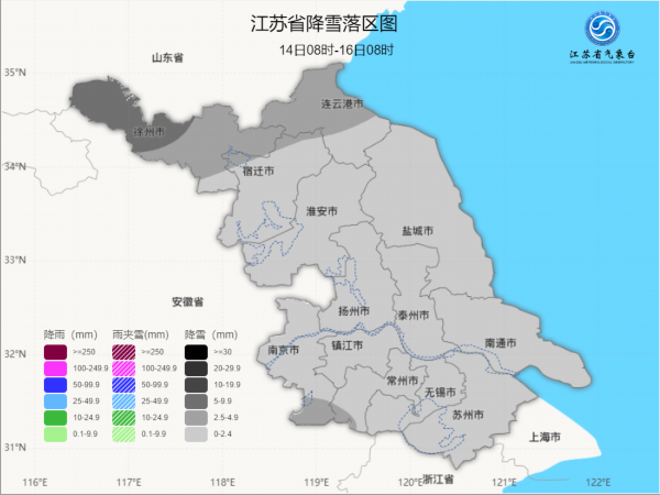图为1月14日08时-16日08时江苏省累计降雪量