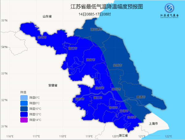 图为1月14-17日江苏最低气温降温幅度预报图