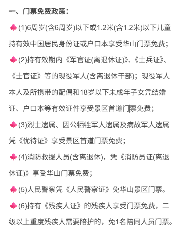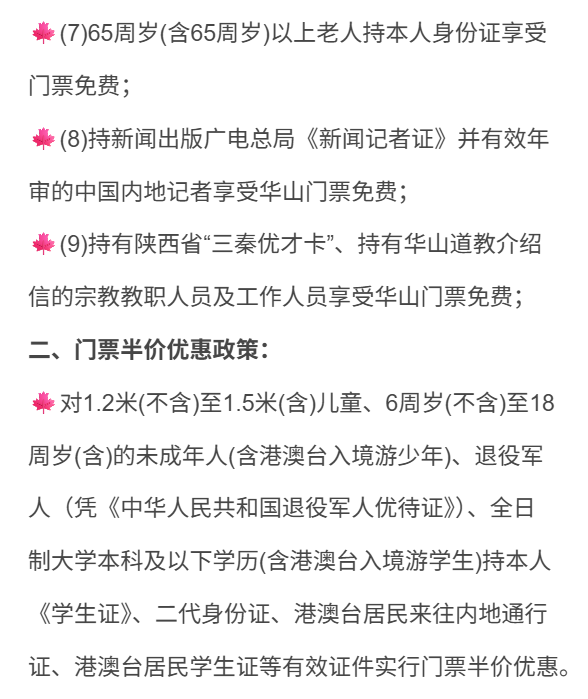 2、华山门票优惠政策: