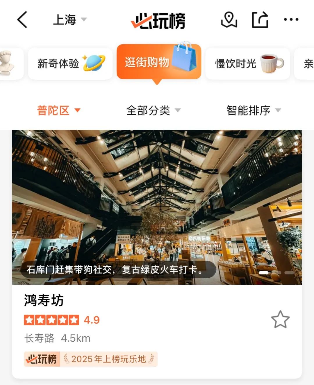 在本次榜单中,普陀区表现亮眼,共有鸿寿坊、天安千树UMEPLAY多感官实景游戏和118广场“拾叁唐”酒吧这些点位成功入围,充分展现了普陀区丰富的休闲资源和独特的区域魅力。