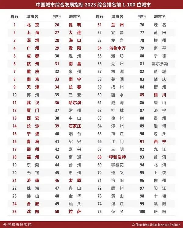 中国城市综合发展指标2023综合排名前1-100位城市