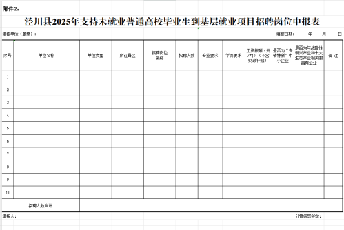 2.填报《泾川县2025年支持未就业普通高校毕业生到基层就业项目招聘岗位申报表》一份(见附件)。