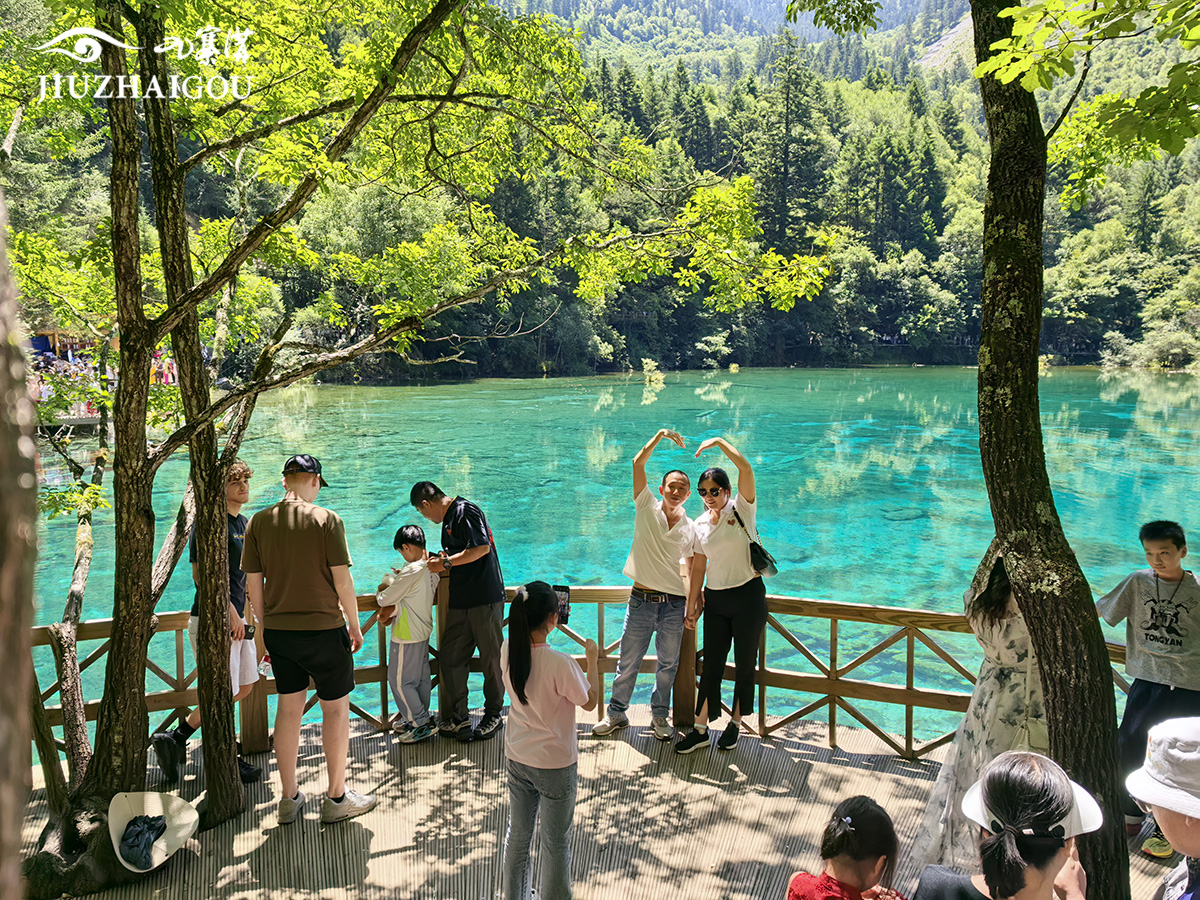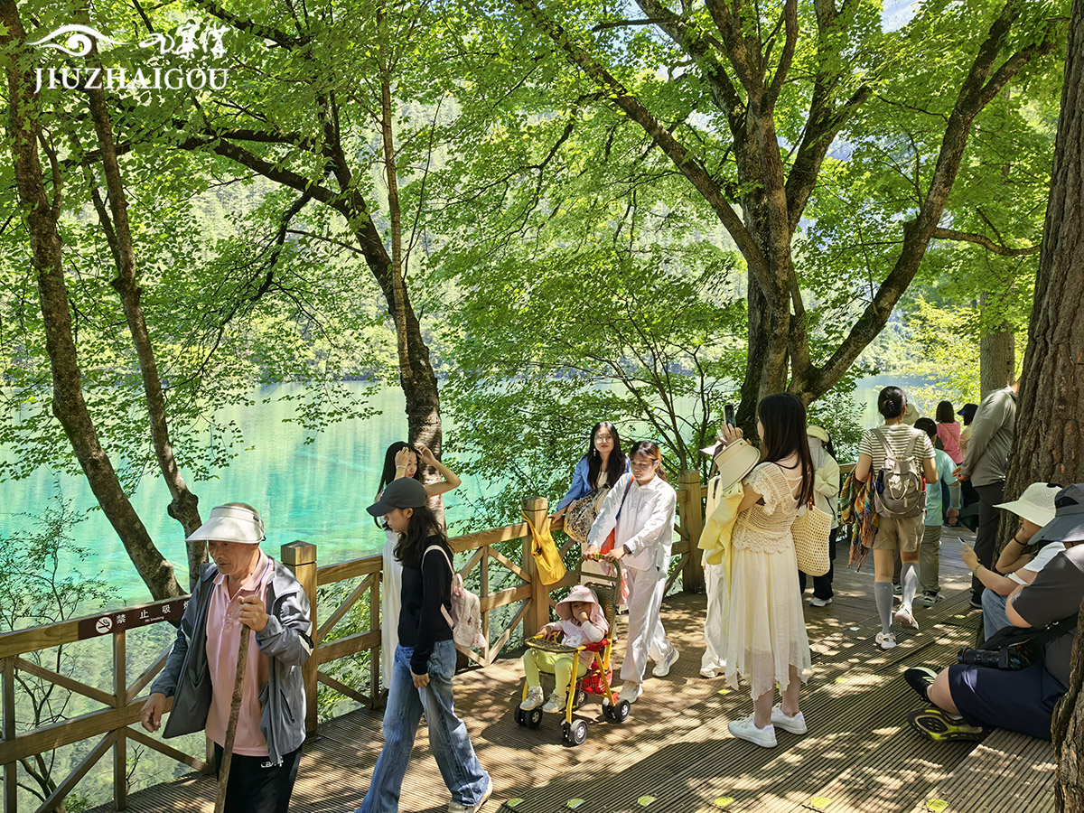 清风送爽,翠海纳凉。澄澈的阳光穿透山间薄雾,在飞瀑跌宕的水幕中折射出条条绚烂的虹彩,清凉的水雾随风扑面,青绿蓝调的翠海倒映着悠然的白云,景区20℃的宜人沁凉,点燃游人奔赴山海的热情,当日,九寨沟接待游客4.1万人次,达到景区最大承载量,迎来暑期旅游高峰。面对客流高峰,九寨沟管理局依托数智管理与精细服务书写着“人潮与山水共舞”的旅游新范式。